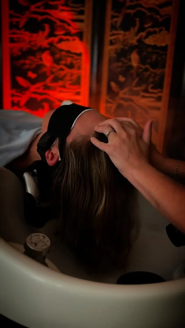 fully immerse in 90 minutes of scalp & soul care with scalp cleanse & detox, revitalizing steam cap, facial & hand massage, moisturizing scalp massage, a relaxing waterfall headbath & blowdry